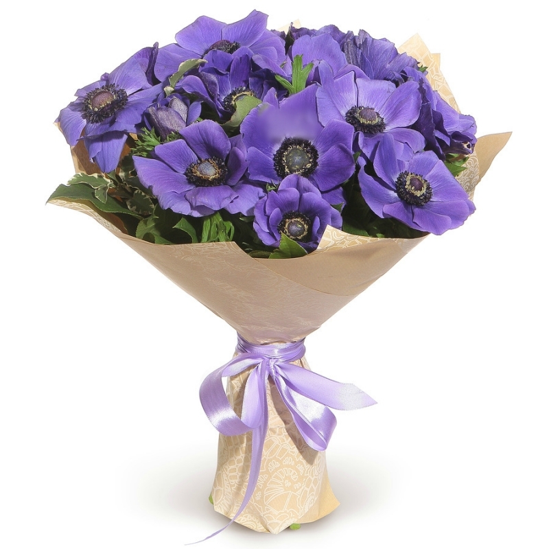 Букет состоит из 19 синих анемонов, зелень, крафт, атласная лента.