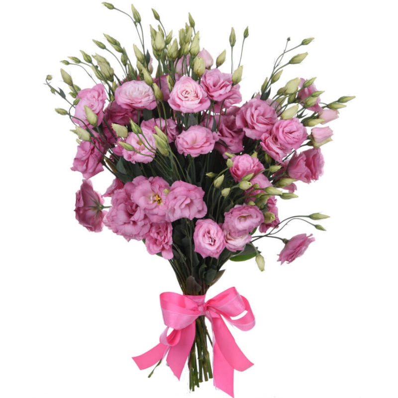 Букет состоит из 17 веток розовой эустомы, прозрачная упаковка, атласная лента.