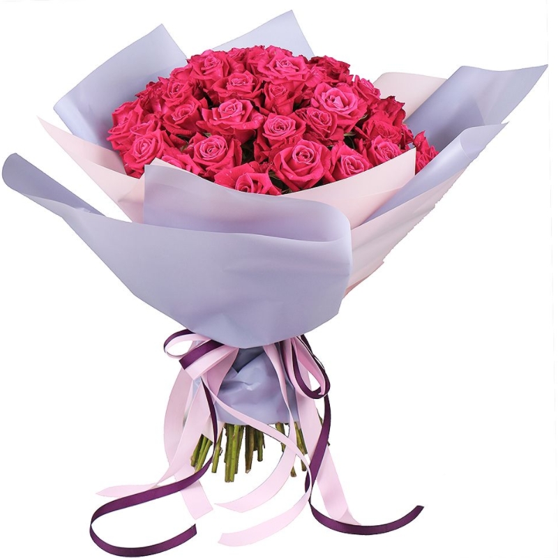 Букет состоит из 45 малиновых роз, красивая упаковка, атласная лента.